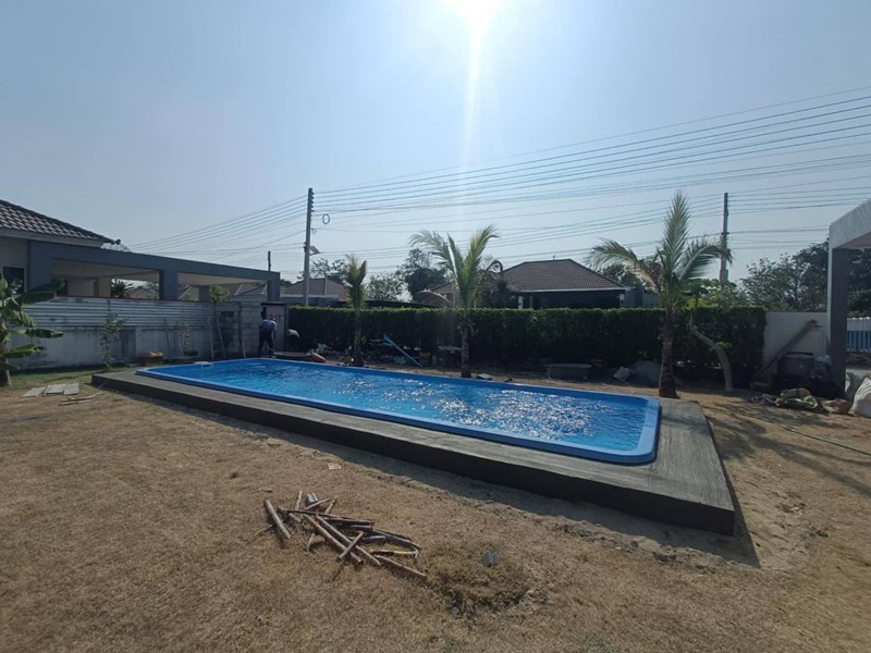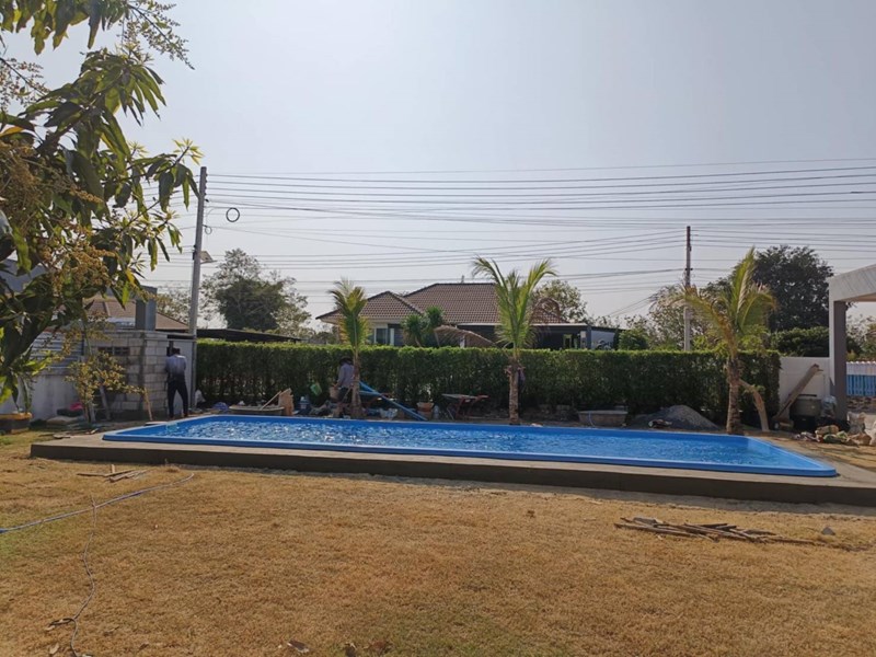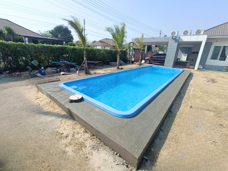 Nova 10M at Lopburi province. Dimension : 10mx3.2mx1.3m. Color : Pool blue color. Step both side to get in. The customer's purpose was to have a pool entrance and exit and to have more swimming space. This model perfect for his backyard.